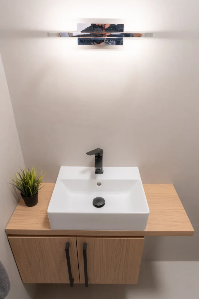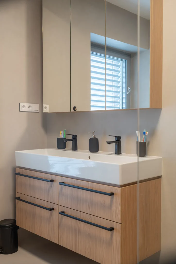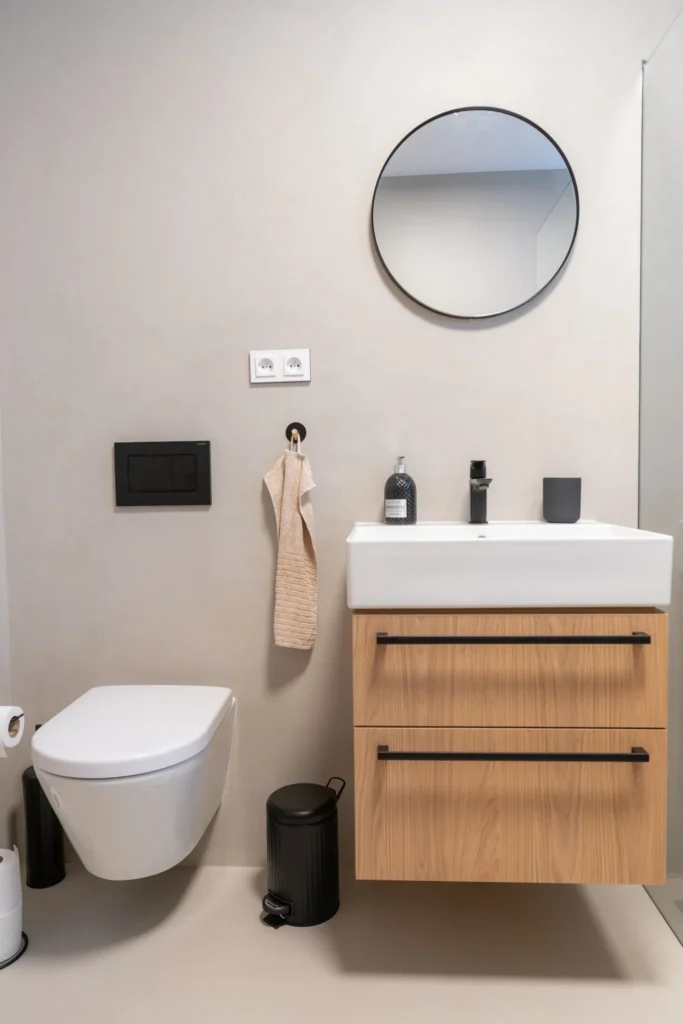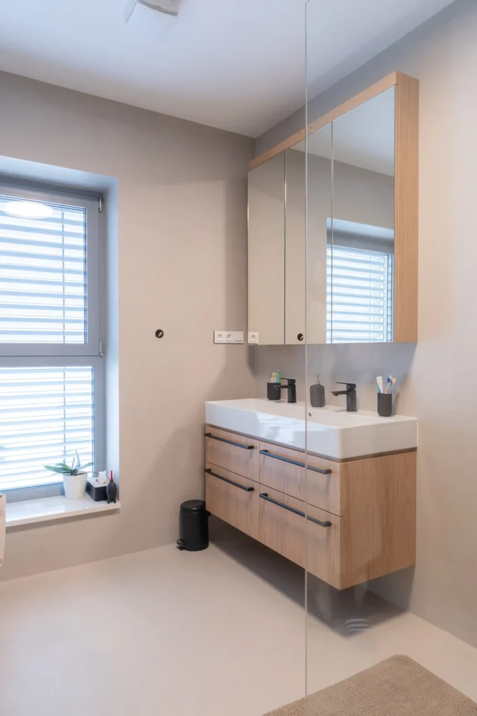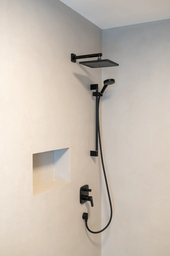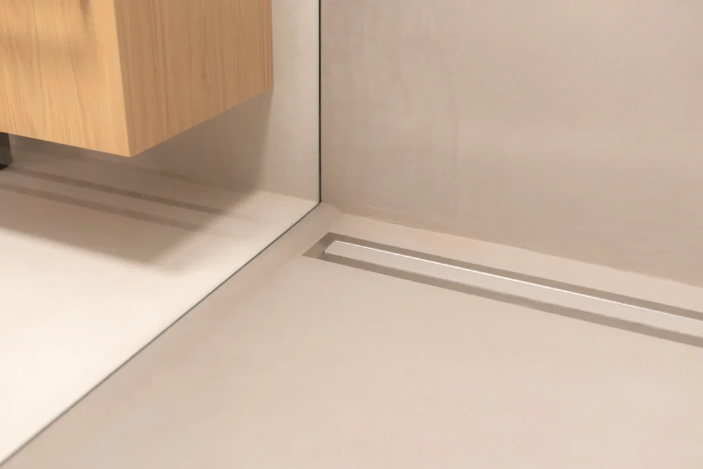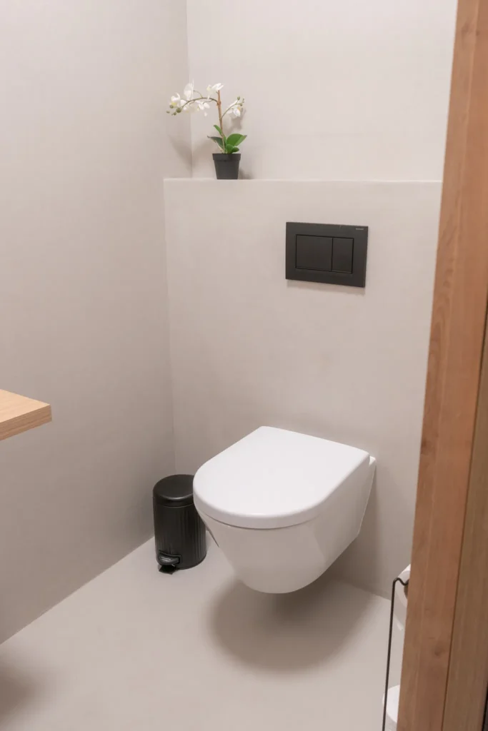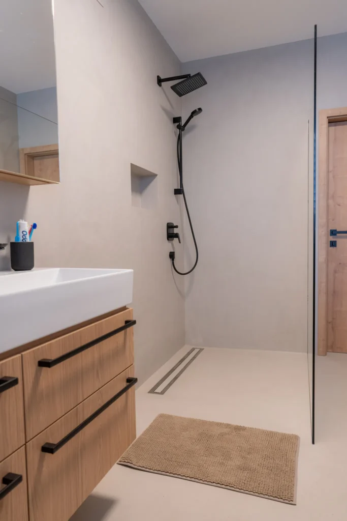 Realizace dvou koupelen a jednoho samostatného WC kompletně do stěrky včetně stylové niky. Výsledný interiér je jednoduchý, beze spár a snadno čistitelný při zachování 100% voděodolnosti i při poškození PU laku.